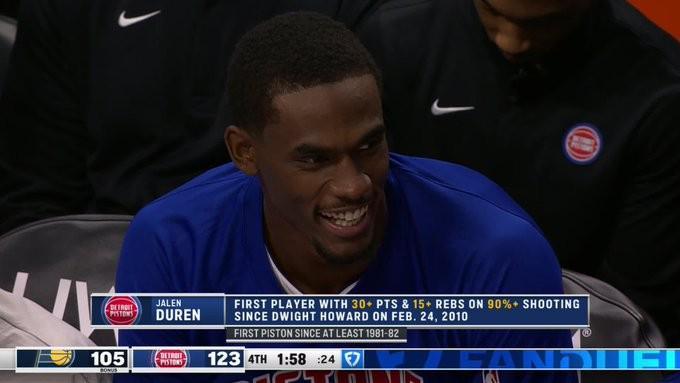 本场比赛,活塞队中锋杰伦-杜伦13投12中砍下31分15篮板3助攻,罚球11投7中。他成为了NBA历史上最年轻的单场砍下30分15篮板且投篮命中率达到90%的球员。同时他也是自2010年德怀特-霍华德以来首位在单场比赛中达成此成就的球员。